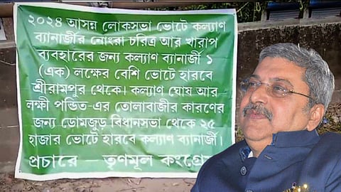 সবুজ রঙের সেই ফ্লেক্সে সাদা অক্ষরে লেখা রয়েছে, “২০২৪ আসন্ন লোকসভা ভোটে নোংরা চরিত্র আর খারাপ ব্যবহারের জন্য কল্যাণ ব্যানার্জী এক লক্ষেরও বেশি ভোটে হারবেন শ্রীরামপুর থেকে।“