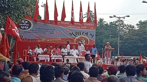 ইউনিয়নের সর্বভারতীয় সভাপতি এ বিজয়রাঘবন সমাবেশে বলেন, “দিল্লিতে মোদী, এখানে দিদি - দুইজনই গরিব-খেতমজুর বিরোধী। রাজ্যে ১০০ দিনের কাজ, আবাস যোজনার মতো প্রকল্পে দুর্নীতি করেছে তৃণমূলের সরকার। সেই সুযোগ কাজে লাগিয়ে মোদী সরকার টাকা বন্ধ করে দিয়েছে। এখন দিদি দিল্লি যাবেন আন্দোলন করতে বকেয়া টাকা আদায়ের জন্য। এতদিন কি দিদি ঘুমিয়ে ঘুমিয়েছিলেন?”