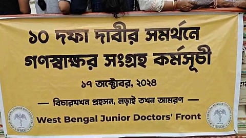 বৃহস্পতিবার বেলা ১২টা থেকে শহরের বিভিন্ন প্রান্তে শুরু হয়েছে এই কর্মসূচি। বুধবার কলকাতা মেডিক্যাল কলেজে বৈঠক করেন জুনিয়র চিকিৎসকদের একাংশ। সেখানেই ঠিক হয় গণস্বাক্ষর সংগ্রহ করা হবে। আজ ধর্মতলার অনশন মঞ্চ থেকে গণস্বাক্ষর কর্মসূচি শুরু হয়। চারটি জায়গায় এই কর্মসূচি চালাচ্ছেন জুনিয়র চিকিৎসকরা।