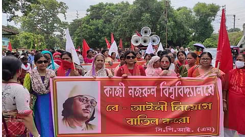 শিক্ষক নিয়োগ দুর্নীতি নিয়ে উত্তাল রাজ্য। বুধবার আন্দোলনরত চাকরিপ্রার্থীদের ধর্না ৫০০ দিন পেরিয়েছে। এই এসএসসি দুর্নীতিকে সামনে রেখেই বৃহস্পতিবার আসানসোলের কাজি নজরুল বিশ্ববিদ্যালয় ঘেরাও অভিযান করল সিপিআই(এম)।
