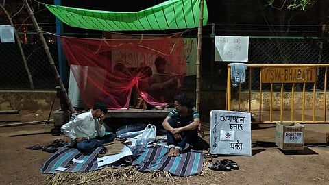 ৯ জানুয়ারি রাস্তা ফেরতের দাবিতে ছাতিমতলায় মৌন অবস্থানে করেছিলেন বিশ্বভারতীর উপাচার্য বিদ্যুৎ চক্রবর্তী এবং অন্য অধ্যাপক-অধ্যাপিকা, কর্মী, আধিকারিকদের একটা অংশ। সেই সময়ে ছাতিমতলার গেটের বাইরে বিক্ষোভ দেখিয়েছিল বাম সমর্থক পড়ুয়ারা। সেদিনের বিশৃঙ্খলার জেরে তিনজন পড়ুয়াকে তিন মাসের জন্য সাসপেন্ড করে বিশ্বভারতী। সাসপেনশনের সময়কাল পেরিয়ে যাওয়ার পরও ফের ওই পড়ুয়াদের সাসপেন্ড করে বিশ্ববিদ্যালয় কর্তৃপক্ষ। তার জেরে প্রায় একটা শিক্ষাবর্ষ নষ্ট হয়ে যাওয়ার আশঙ্কা করছেন তাঁরা। কোনওরকম বিজ্ঞপ্তি জারি না করেই কেন তাঁদের ফের সাসপেন্ড করা হল, তার প্রতিবাদে তাঁরা ধরনায় বসেছেন।