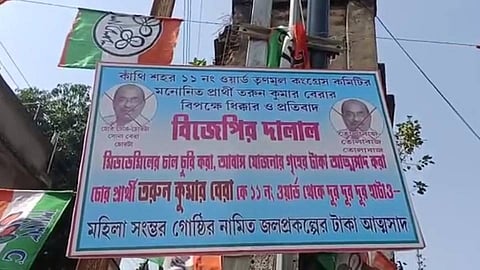 শনিবার সরস্বতী পুজোর দিনে রাতের অন্ধকারে প্রার্থী তরুণ কুমার বেরার নামে পড়ে পোস্টারটি। সেখানে আরও লেখা রয়েছে, ‘বিজেপির দালাল, মিড ডে মিলের চাল চোর , আবাস যোজনার টাকা আত্মসাৎ, এমন চোর প্রার্থী তরুণ কুমার বেরাকে ১১ নং ওয়ার্ড থেকে দূর হাটাও।' তবে শহরের একাধিক জায়গায় তৃণমূলের কারা এই পোস্টার লাগিয়েছে, তা অবশ্য জানা যায়নি। কিন্তু পোস্টার ঘিরে রাজনৈতিক মহলে ব্যাপক উত্তেজনা ছড়িয়েছে। শুরু হয়েছে জোর জল্পনা।