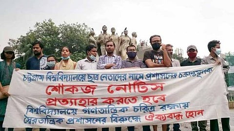 শোকজপত্রে বলা হয়েছে, ‘চট্টগ্রাম বিশ্ববিদ্যালয় প্রশাসনের এই সকল কার্যক্রমকে কেন রাষ্ট্রের আইন ও সংবিধান পরিপন্থী ও অবৈধ ঘোষণা করা হবে না এবং তিন শিক্ষার্থীর বিরুদ্ধে আনীত অভিযোগ ও ইস্যুকৃত শোকজ নোটিশ কেন প্রত্যাহার করা হবে না- এই মর্মে বিশ্ববিদ্যালয় প্রশাসনকে আগামী সাত কর্মদিবসের মধ্যে লিখিতভাবে জবাব দেয়ার জন্য বলা হলো।’