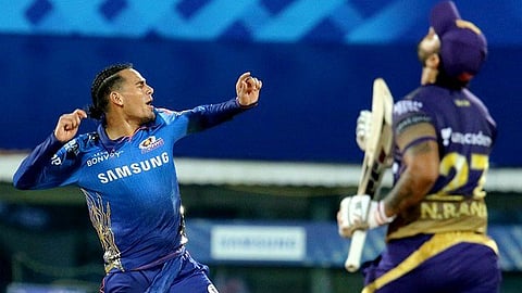 চেন্নাইয়ে এদিন টসে জিতে প্রথমে বল করার সিদ্ধান্ত নেয় কলকাতা নাইট রাইডার্স। ব্যাট করতে আসা মুম্বইকে শুরুতেই ধাক্কা দেয় বরুন চক্রবর্তী। প্রোটিয়া উইকেট কিপার ব্যাটসম্যান কুইন্টন ডিকক মাত্র ২ রানেই ফিরে যান। এরপর অবশ্য রোহিত শর্মা এবং সূর্যকুমার যাদব জুটি মুম্বইকে এগিয়ে নিয়ে যেতে থাকেন। রোহিত শর্মা ৩২ বলে ৪৩ রান করেন এবং সূর্যকুমারের ব্যাটে আসে ৩৬ বলে ৫৬ রানের অনবদ্য ইনিংস। তবে রোহিত এবং সূর্যকুমার ফিরে যাওয়ার পর ব্যাটিং বিপর্যয়ের মুখে পড়ে মুম্বই। মিডিল অর্ডারে রোহিত শর্মাদের মেরুদন্ড ভেঙে দেয় নাইটরা। ইশান কিশান(১),হার্দিক পান্ডিয়া (১৫),কায়রন পোলার্ড (৫), ক্রুনাল পান্ডিয়া(১৫),মার্কো জেনশেনরা(০) দাঁড়াতেই পারেনি।