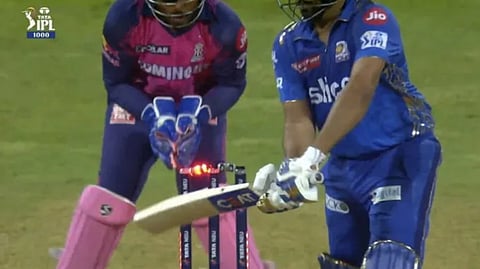 টান টান উত্তেজনার এক ম্যাচে রবিবার রাজস্থান রয়্যালসকে হারিয়ে জয় তুলে নিয়েছে মুম্বই ইন্ডিয়ান্স। রাজস্থানের সংগ্রহ করা ২১২ রানের জবাবে ব্যাট করতে নেমে তিন বল হাতে রেখেই জয় পায় মুম্বই। শেষ ওভারে জয়ের জন্য প্রয়োজন ছিল ১৭ রান। জেশন হোল্ডারকে টানা তিন বলে তিনটি ছক্কা হাঁকিয়ে তিন বল হাতে রেখেই মুম্বইকে ম্যাচ জেতান টিম ডেভিড। তবে মুম্বই জিতলেও এই ম্যাচে রোহিত শর্মার আউট নিয়ে তৈরি হয়েছে জোর বিতর্ক। মুম্বই অধিনায়ক রোহিত যে বলে আউট হয়েছেন, সেখানে বলের ধাক্কায় বেল পড়ে গিয়েছে, নাকি রাজস্থানের অধিনায়ক সঞ্জু স্যামসনের গ্লাভসের ধাক্কায় বেল পড়ে গিয়েছে, তা নিয়ে প্রশ্ন উঠতে শুরু করেছে।