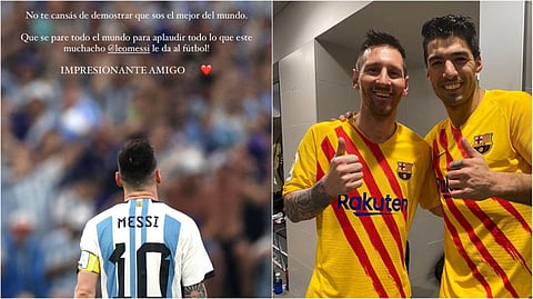 মেসির অসাধারণ সব পাসে মুগ্ধ হয়ে সুয়ারেজ লেখেন, 'নিজেকে পৃথিবীর শ্রেষ্ঠ প্রমাণ করার জন্য ক্লান্ত হয়ো না। ফুটবলের জন্য তুমি যা করেছ তার জন্য গোটা বিশ্ব উঠে হাততালি দিচ্ছে। এক কথায় অসাধারণ বন্ধু'।