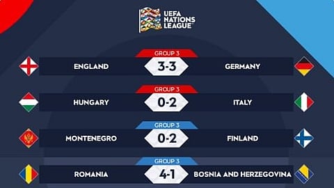 অন্যদিকে, হাফ ডজন গোলের থ্রিলিং ম্যাচ ওয়েম্বলিতে। নিয়মরক্ষার ম্যাচে নেমে ইংল্যান্ড এবং জার্মানি লড়াই চালালো সমানে সমানে। প্রথমার্ধে গোল শূন্য থাকা ম্যাচ শেষ হল ৩-৩ ব্যবধানে ড্রয়ের মাধ্যমে।